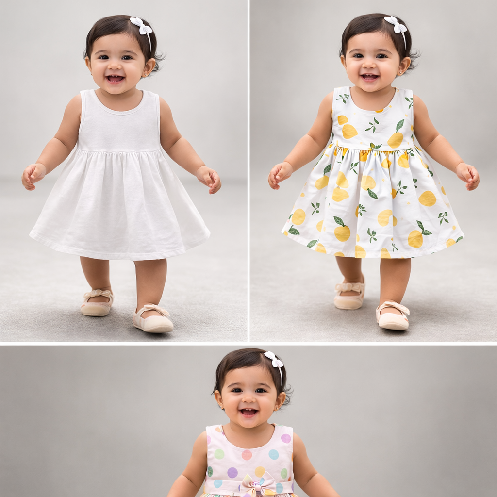 Yellow printed pure cotton muslin Frock| Set of one lemon print and two plain white muslin frocks |Age 0-12 months and 1-2 years .