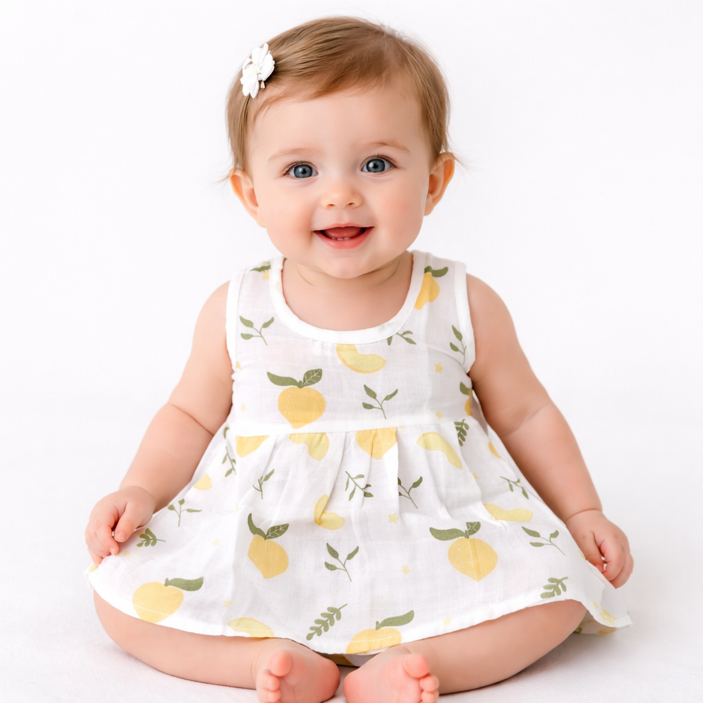 The Snugs and Tales 100% Organic Cotton Muslin Lemon Print Frock brings a burst of sunny charm and pure comfort to your baby’s wardrobe. Featuring an adorable lemon print, this ultra-soft frock is crafted for everyday wear, keeping your little one cool, cozy, and stylish from playtime to naptime.